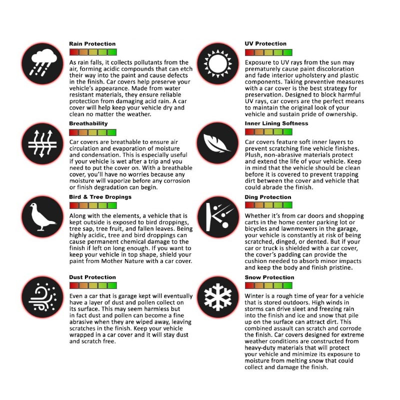 اگر خودرو شما به صورت مداوم در معرض نور آفتاب و شرایط بد آب و هوایی مانند برف و باران باشد، این امر منجر به آفتاب سوختگی رنگ خودروها و یا زنگ زدگی بدنه می شود. این آسیب در خودروهای با رنگ تیره در آفتاب بیشتر است. چون رنگ تیره جاذب انرژی است. از طرف دیگر ضرر آفتاب، برای الیاف پارچه ای روکش صندلی خودروها یا روکش های چرمی آن ها نیز آسیب زاست و می تواند عمر آن ها را تا حد زیادی کاهش دهد. علاوه بر این در سایر فصل ها نیز چادر خودرو می تواند، خودرو را از گرد و غبار و بارش باران محافظت کند.