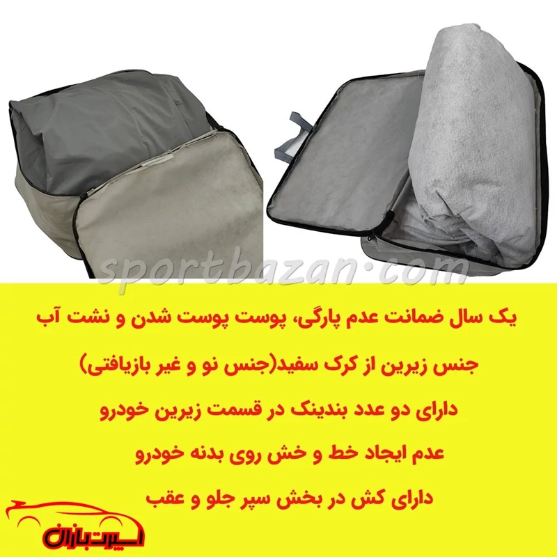 سایر توضیحات : دارای دو عدد بندینک در قسمت زیرین خودرو, دارای کش در بخش سپر جلو و عقب, یک سال ضمانت عدم پارگی، پوست پوست شدن و نشت آب