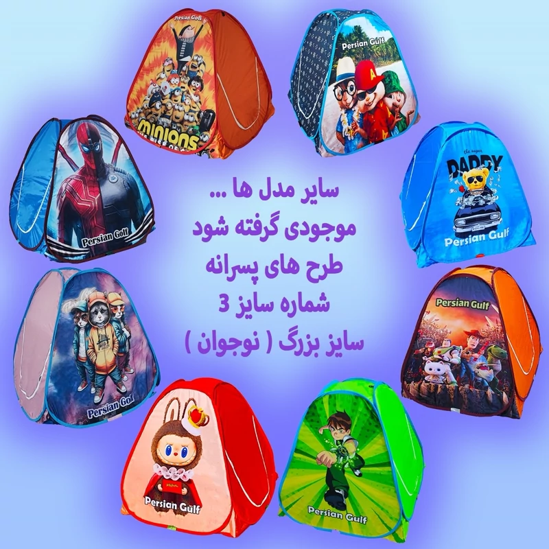 تذکر : کلیه چادر های کودک با طرح اصلی ثابت ارائه شده و طرح و رنگ قسمت درب چادر با توجه به وارداتی بودن آن ، متغیر میباشد.