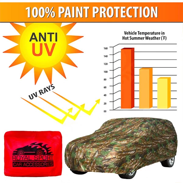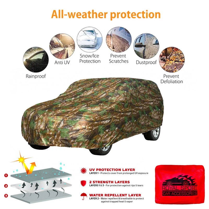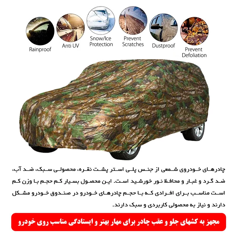 سایر توضیحات: چادر خودرو مدل استتار رویال اسپرت با طراحی خاص و پارچهی ضدآب، محافظی مطمئن در برابر آفتاب، گرد و غبار و فضولات پرندگان است.