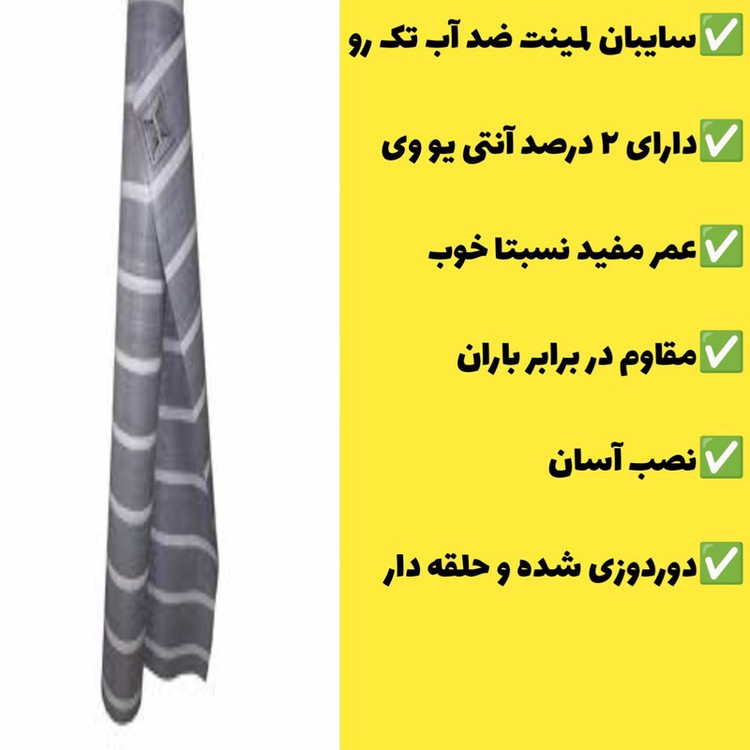✅سایبان لمینت ضد آب تک رو ✅دارای ۲ درصد آنتی یو وی ✅عمر مفید نسبتا خوب✅سایبان لمینت ضد آب تک رو ✅دارای ۲ درصد آنتی یو وی ✅عمر مفید نسبتا خوب ✅مقاوم در برابر باران ✅نصب آسان ✅دوردوزی شده و حلقه دار ✅مقاوم در برابر باران و برف ✅نصب آسان ✅دوردوزی شده و حلقه دار