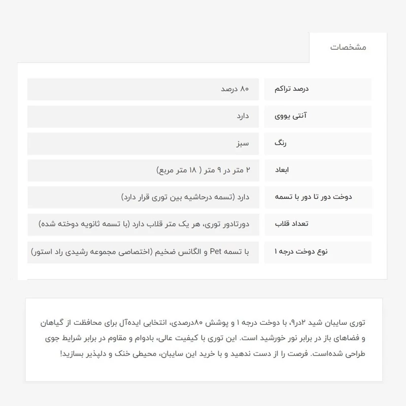 توری شید، 2 در 9، 80 درصد انتی یووی دار میباشد که از اشعه خطرناک خورشید جلوگیری میکند، دوخت درجه 1 (منظور تسمه و دوخت بسیار قویتر میباشد) ، تسمه محکم دور کار و هر متر یک قلاب با تسمه ثانویه دوخت خورده است.