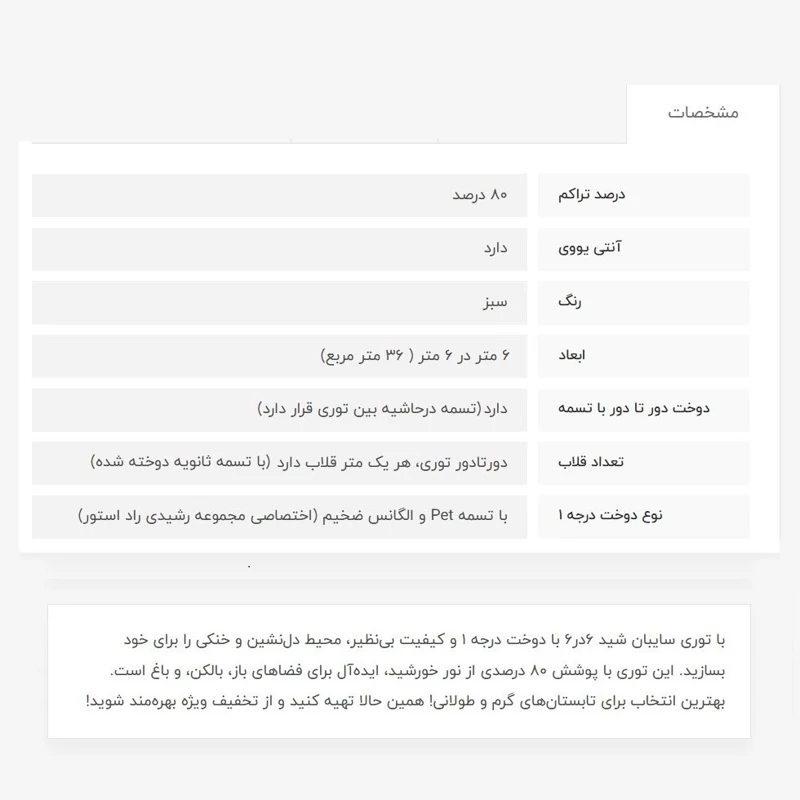 توری شید، 6 در 6، 80 درصد انتی یووی دار میباشد که از اشعه خطرناک خورشید جلوگیری میکند، دوخت درجه 1 (منظور تسمه و دوخت بسیار قویتر میباشد) ، تسمه محکم دور کار و هر متر یک قلاب با تسمه ثانویه دوخت خورده، این محصول اماده هست. این ابعاد اماده و بسته بندی شده هست، زمان تحویل به پست، بسته به زمان ثبت سفارش، بین 1 تا 3 روز میباشد.